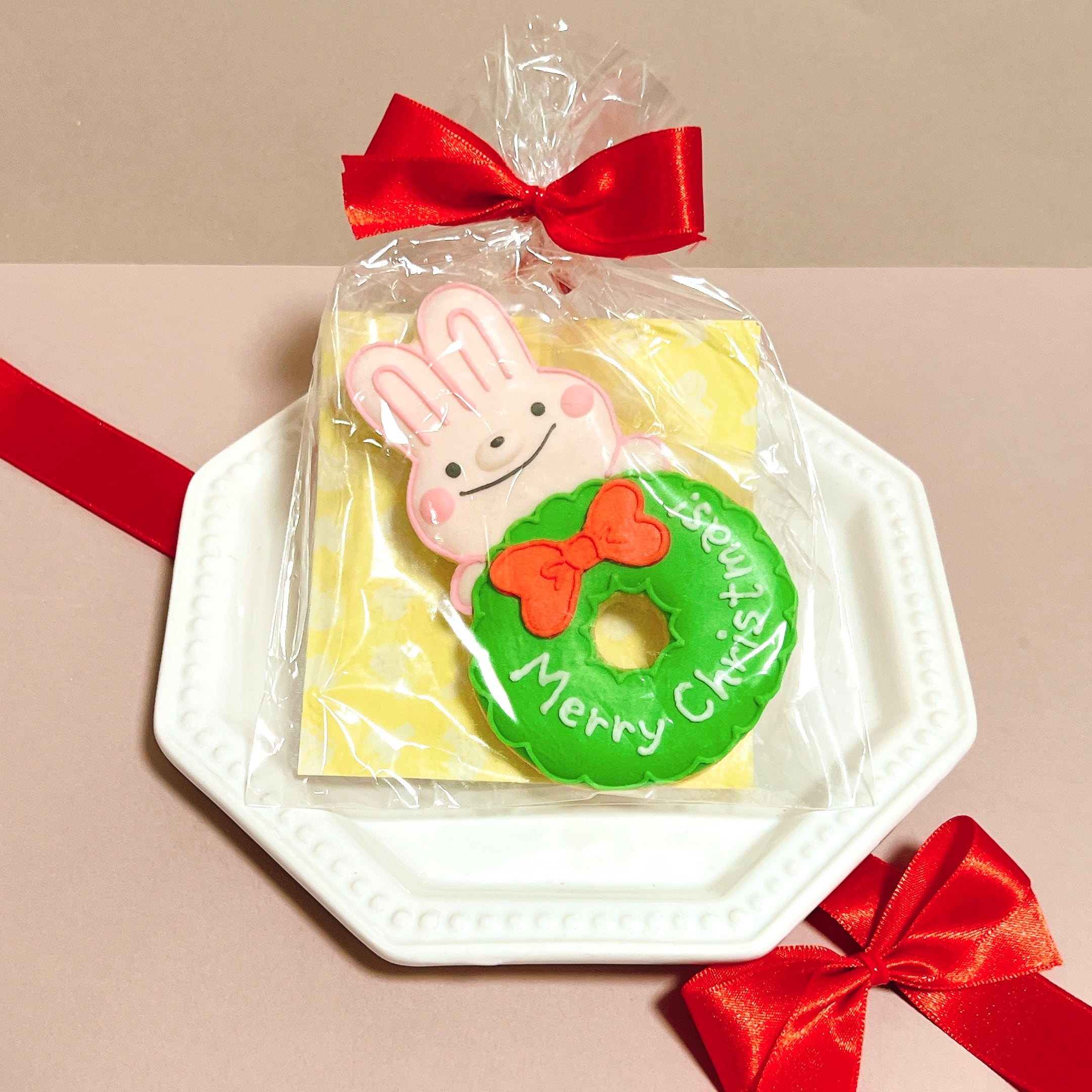 【うさぎリース】アイシングクッキーは、クリスマスシーズンを特別に演出する可愛らしいプチギフトです!愛らしいうさぎとリースのデザインが、見た目にも楽しさを加えており、ギフトとしても喜ばれること間違いなしです。